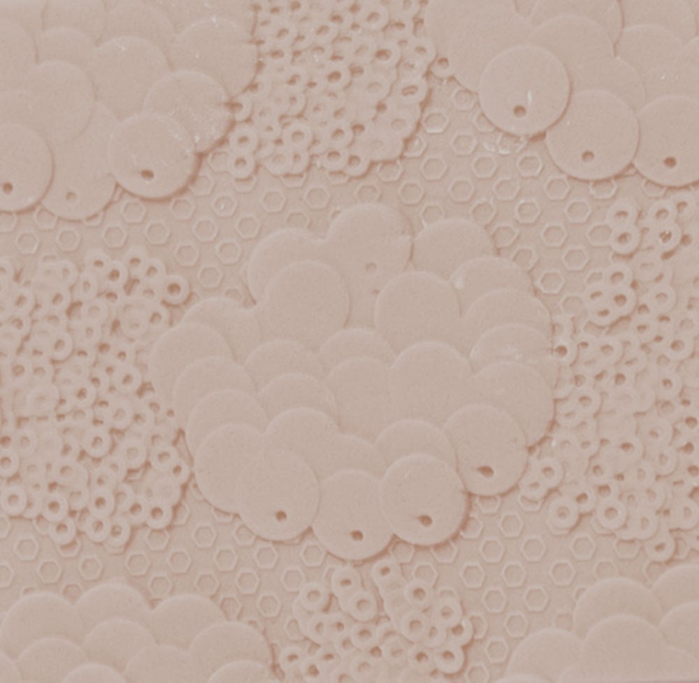 This is a food safe silicone mat to emboss Fondant, Gumpaste and other material to leave a realistic impression of sequin clusters on your artwork. The silicone mat is washable and non-stick.
