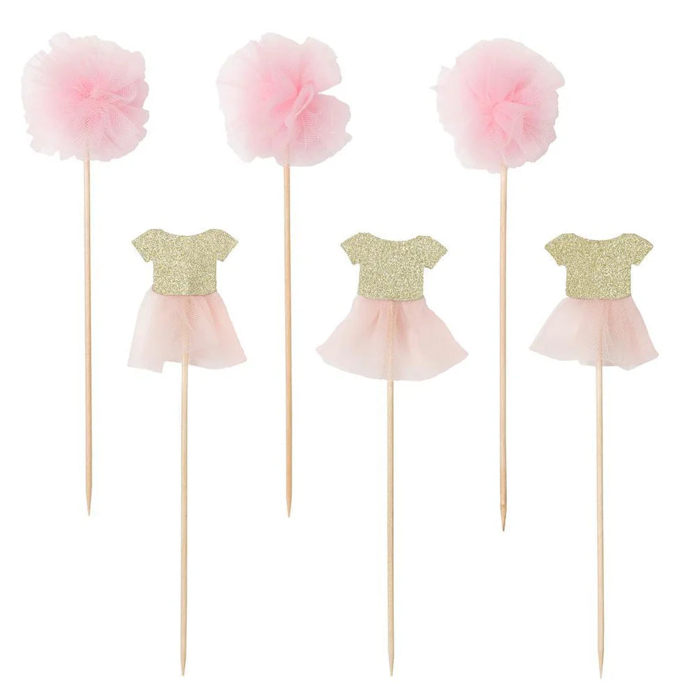 Each pack contains 6 pretty pom pom toppers and 6 adorable tutu toppers, perfect for mixing and matching to add height and flare to a dainty cake!