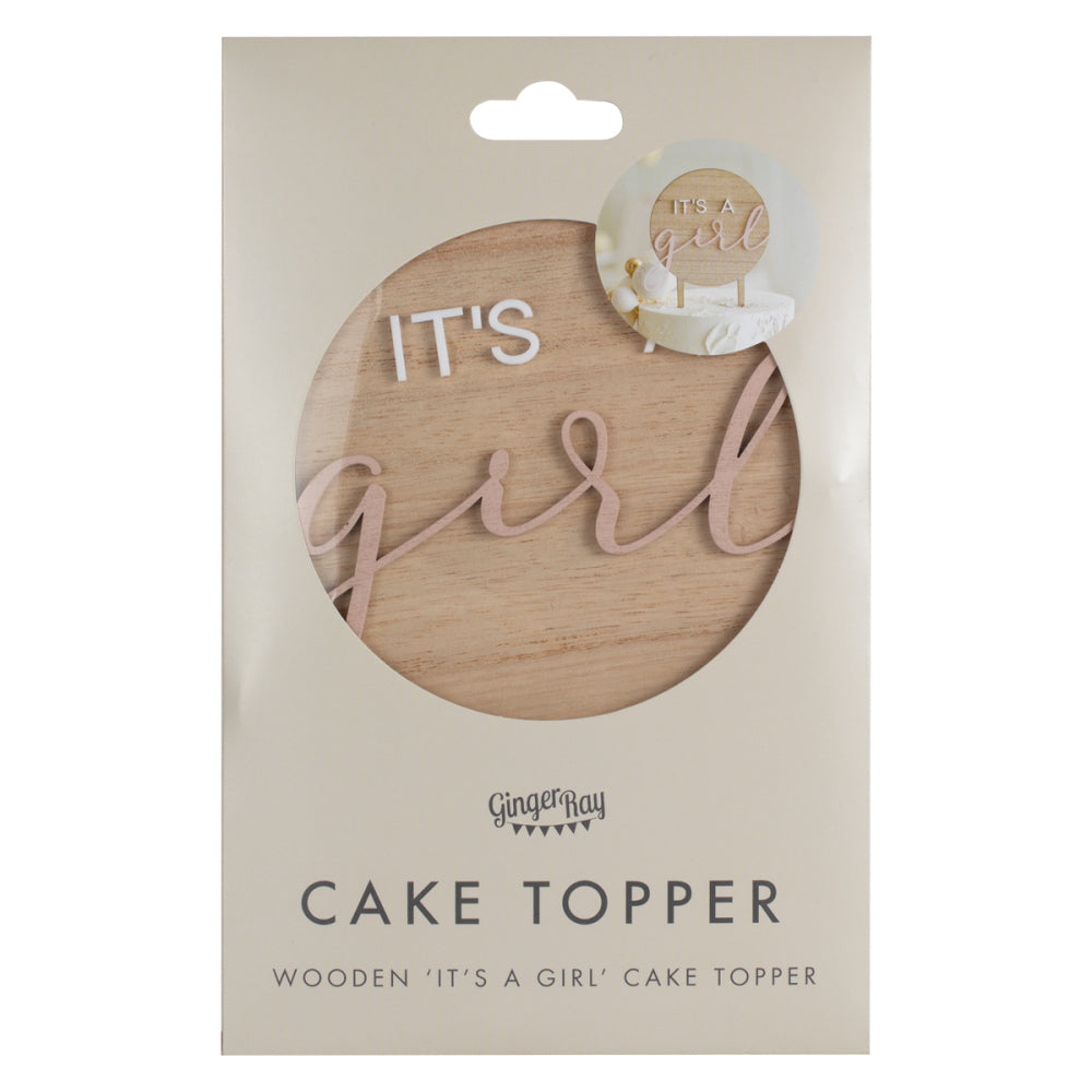 1 x wooden 'It's a girl' baby shower cake decoration, measuring 17.8cm (H) x 12cm (W). Cake topper spikes measure 6.5cm (H)