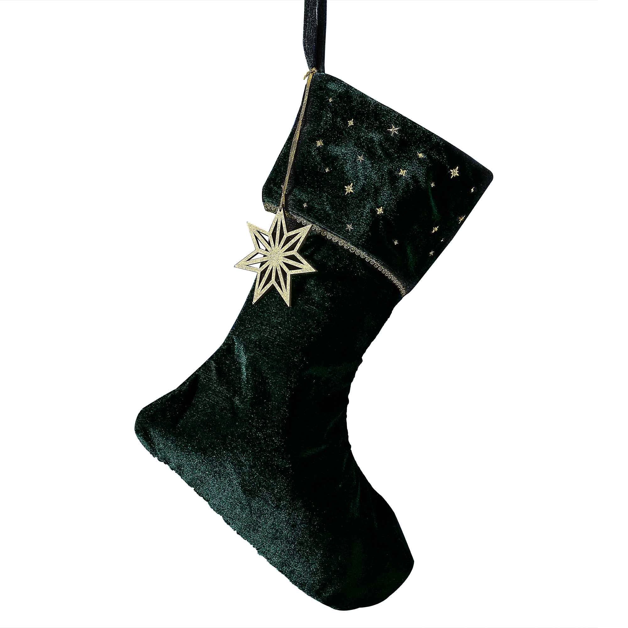 Green velvet Christmas stocking with wooden gold star charm, measuring 42cm (H) x 25cm (W)